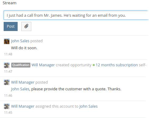 Stay tuned and keep up with changes with Stream functionality. Available on the homepage and on the record level, the Activity Stream allows users to see the list of activities performed on the records, create personalized posts, comment on the updates, and a lot more. Users can monitor the most recent changes and always stay informed about on-going events across the entire company without spending much time and effort.
